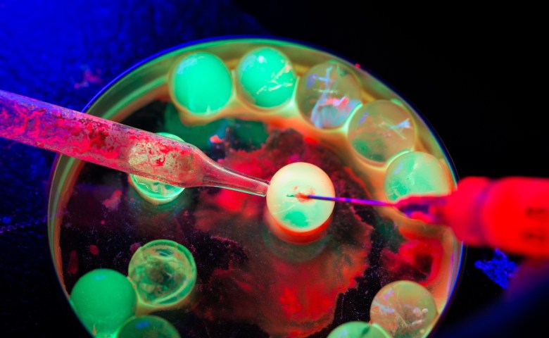Imagen 3: «Transferencia nuclear» (Anna Rock: https://www.anna-rock.com/art/infinite-potentials-a-visual-proposal-of-my-genetically-modified-fantasy/), muestra cómo se verían células madre serían inyectadas con proteínas fluorescentes verdes (GFP). La organización SciArt Initiative/SciArt Center en colaboración con el Cambridge Stem Cell Institute, eligieron esta obra especialmente para que esté en la exposición internacional.